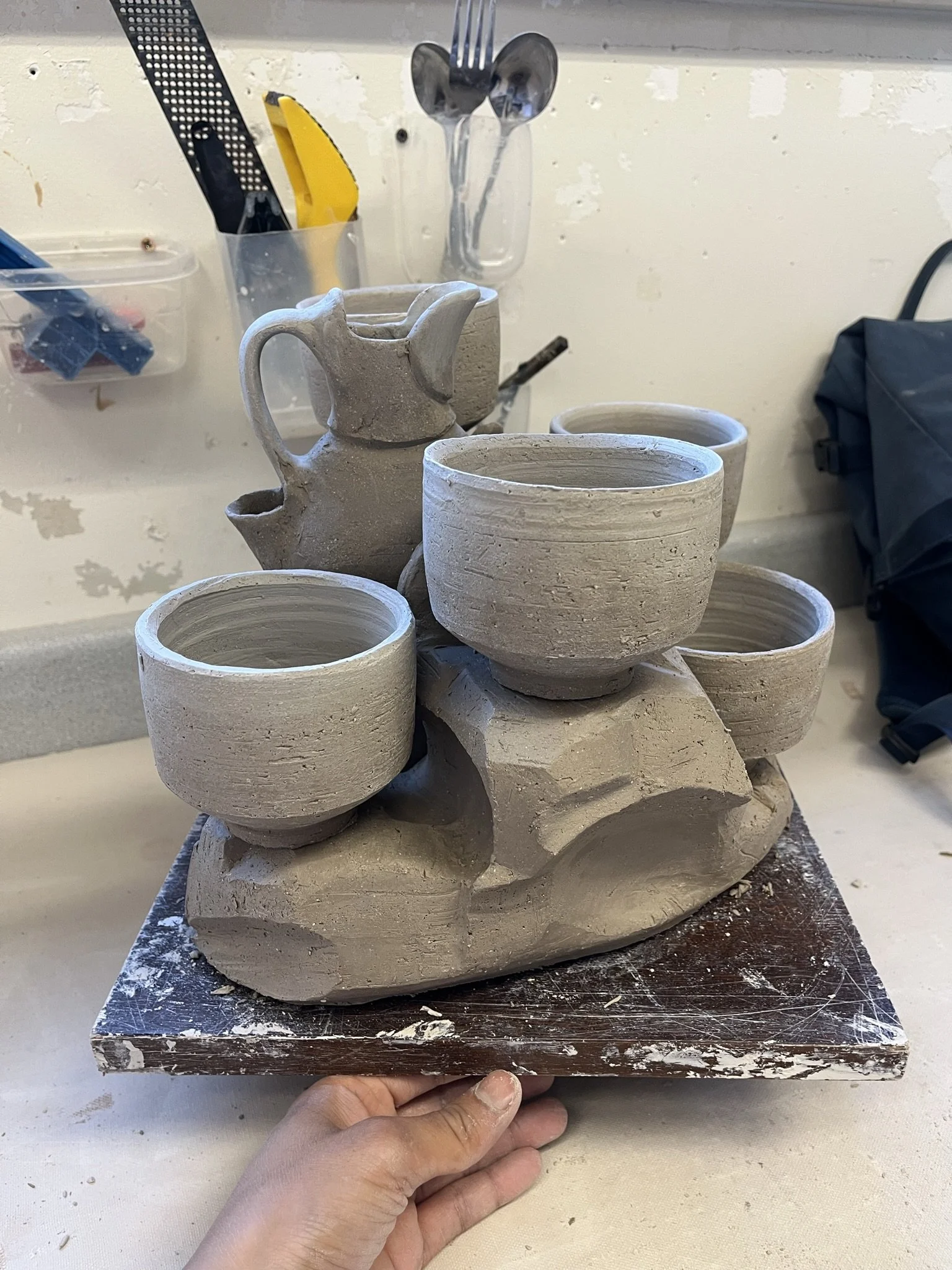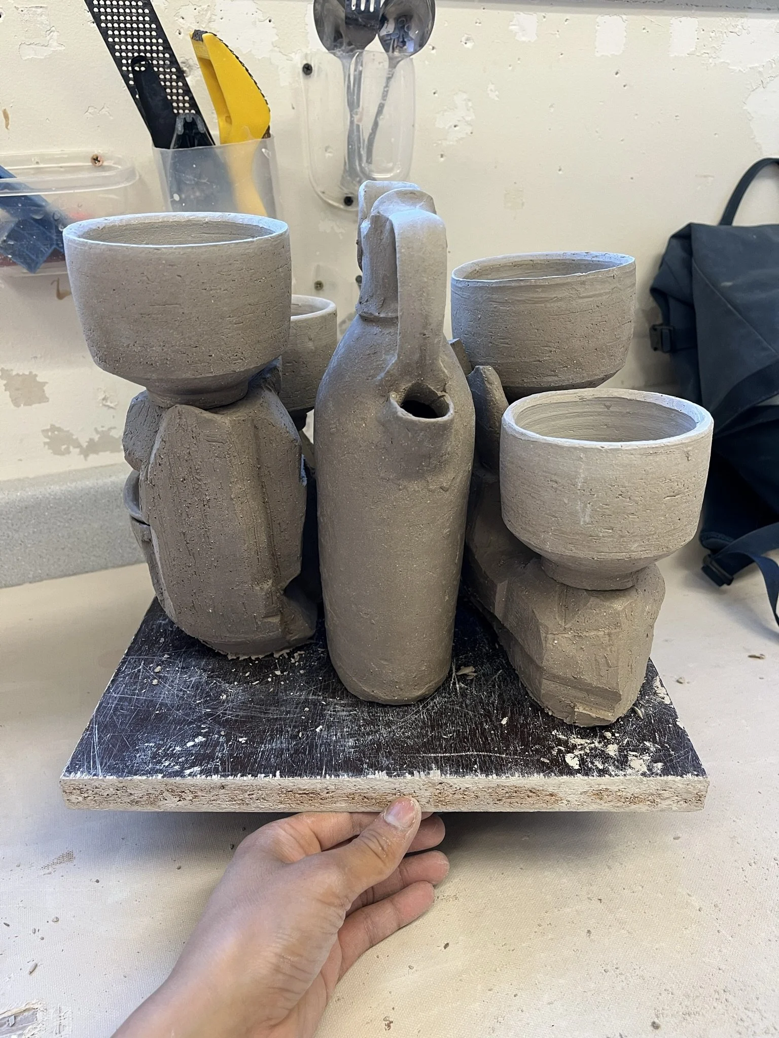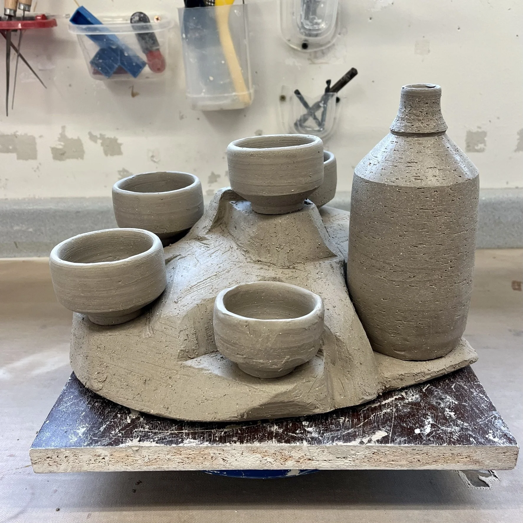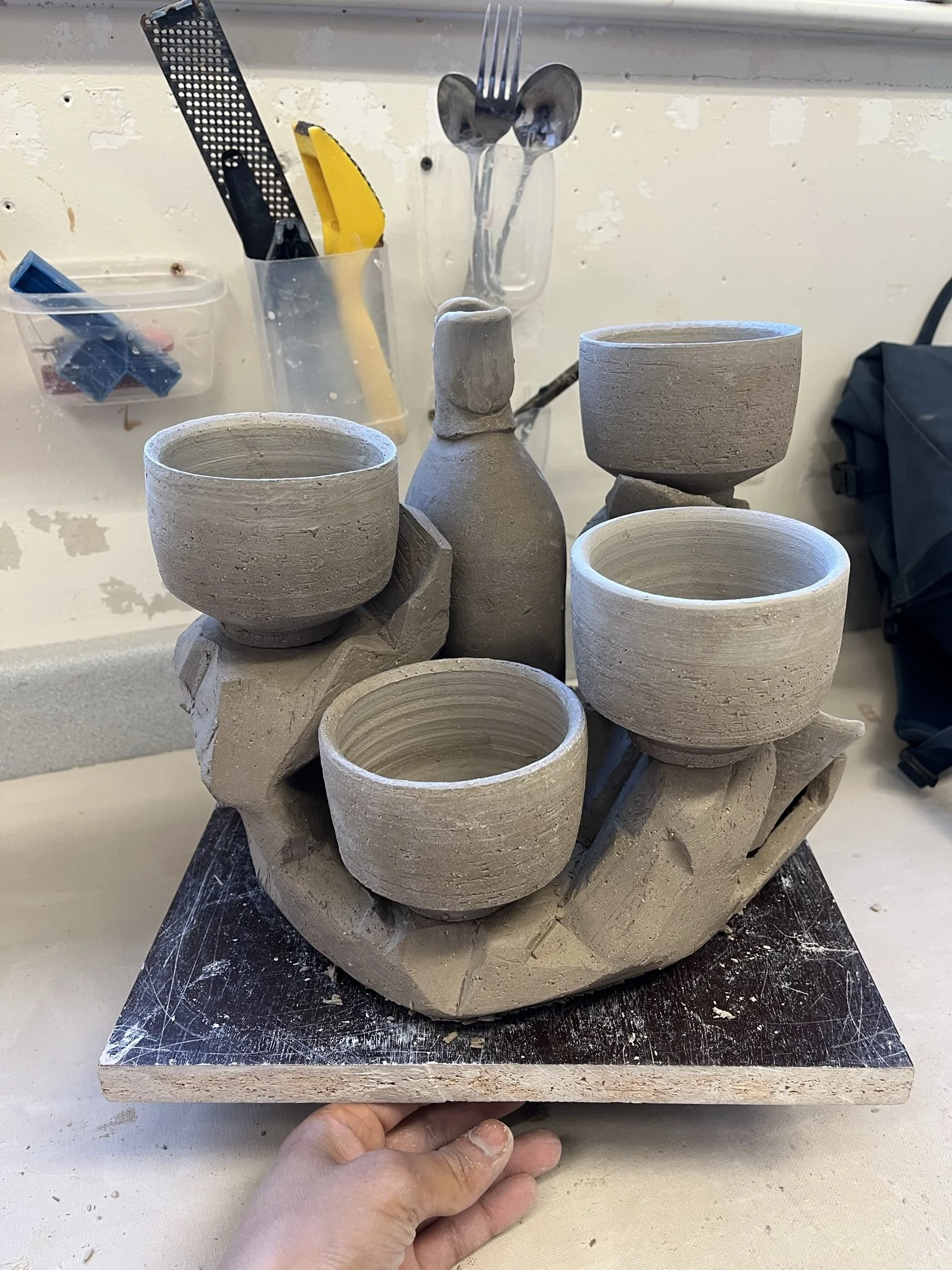 I made three drink sets with pouring vessels. I want to keep exploring the idea of incorporating the firing stand into the final product. The guiding thoughts surrounding the sets and stands are to create a center piece that is able to: