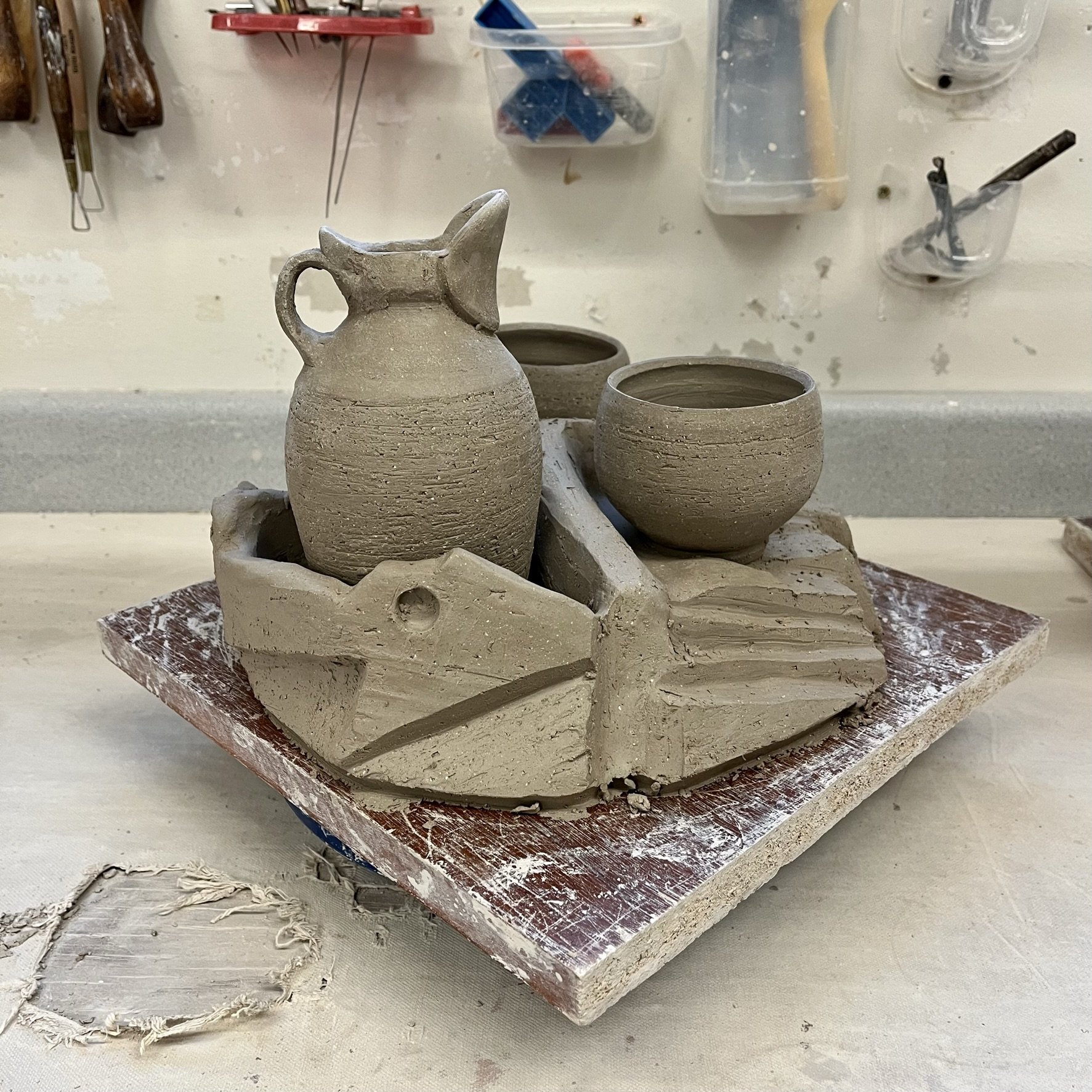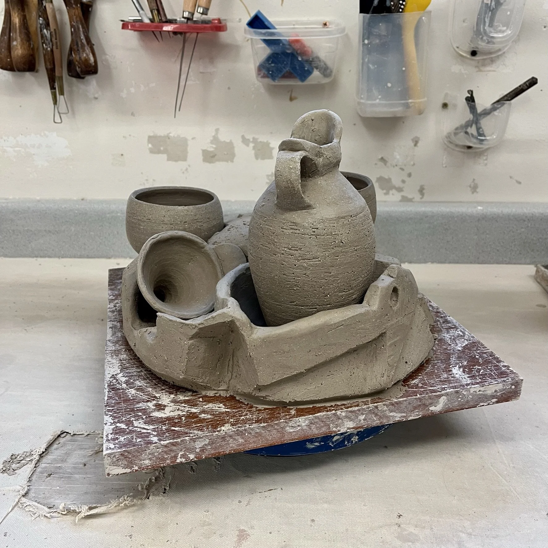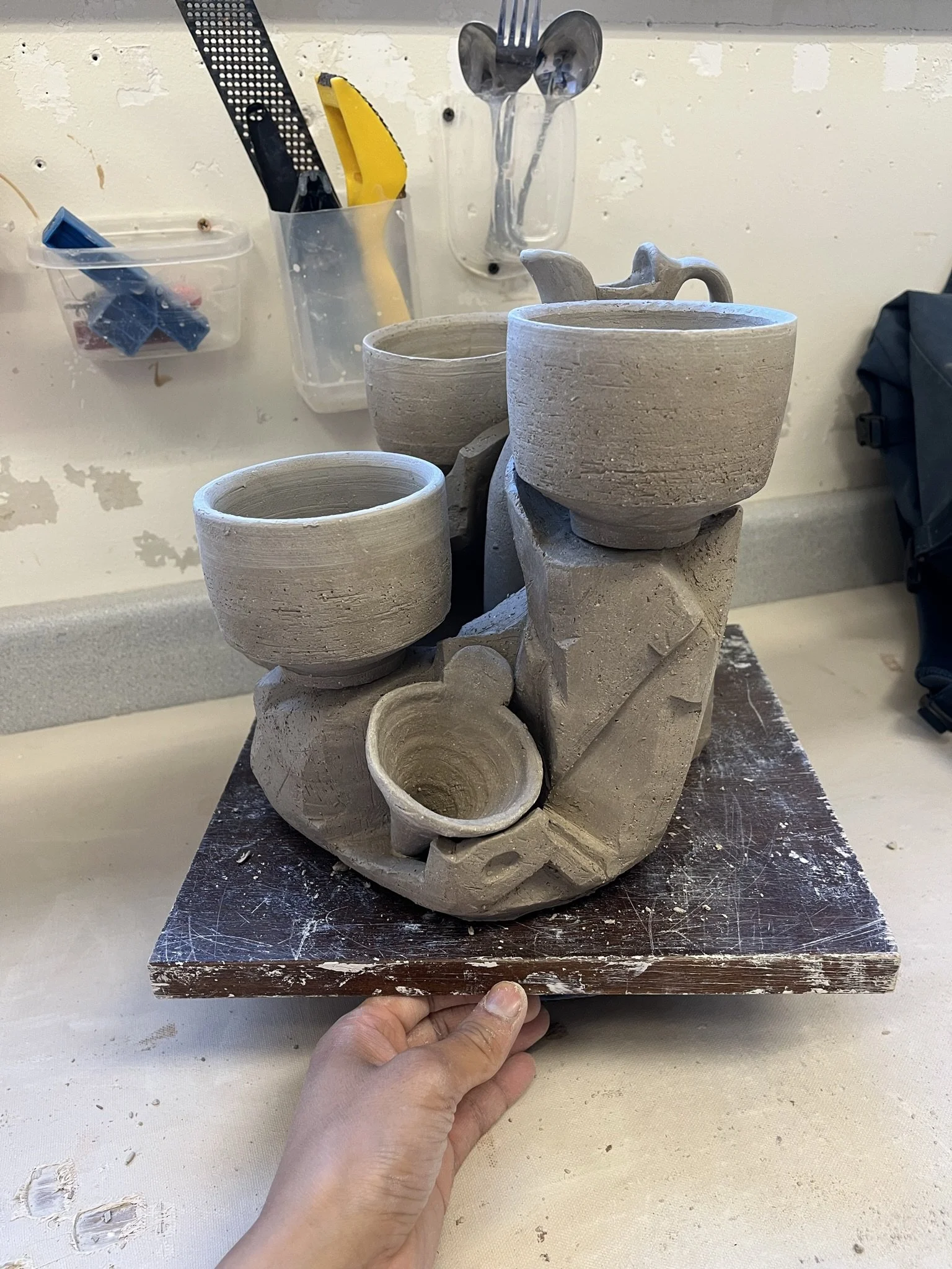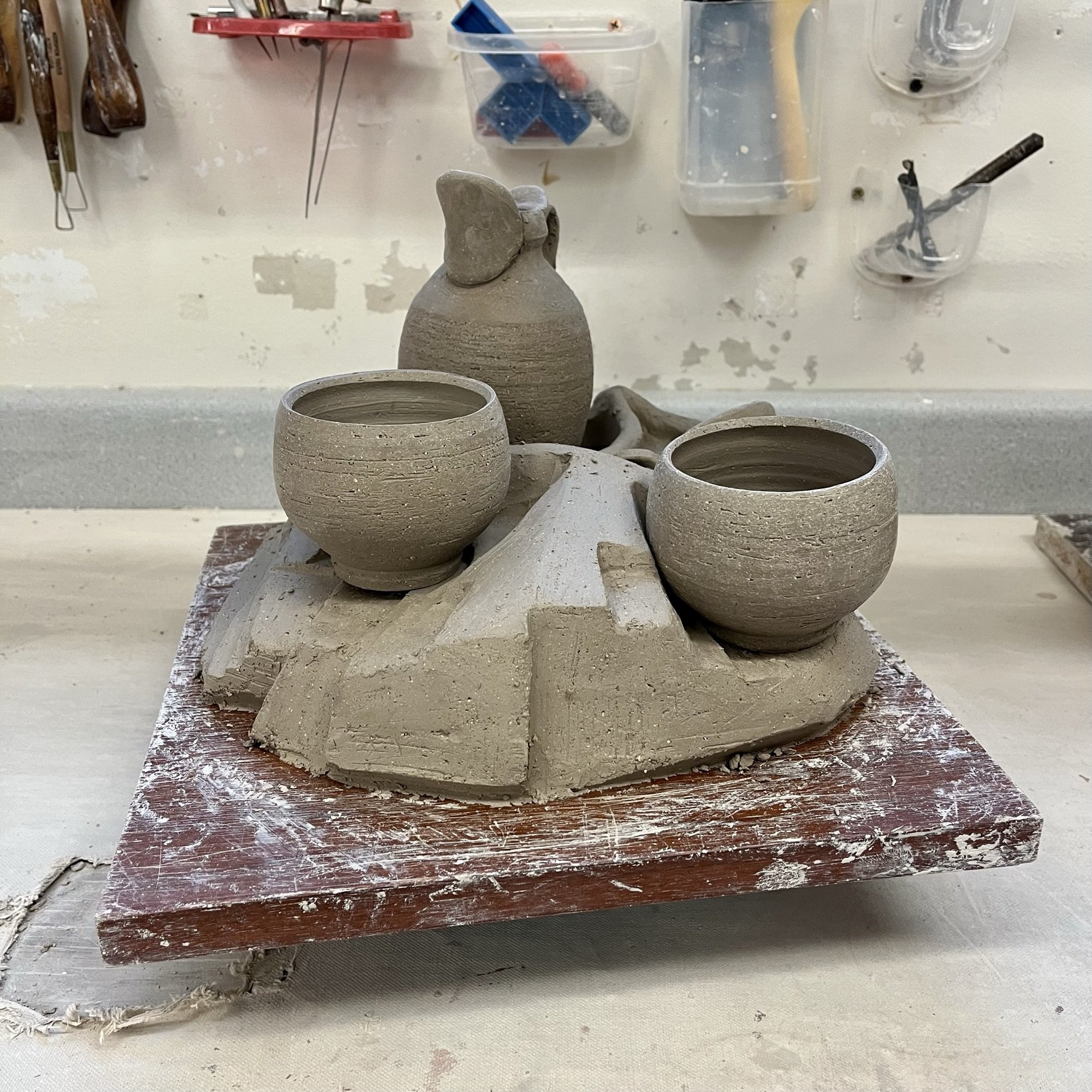 I made three drink sets with pouring vessels. I want to keep exploring the idea of incorporating the firing stand into the final product. The guiding thoughts surrounding the sets and stands are to create a center piece that is able to: